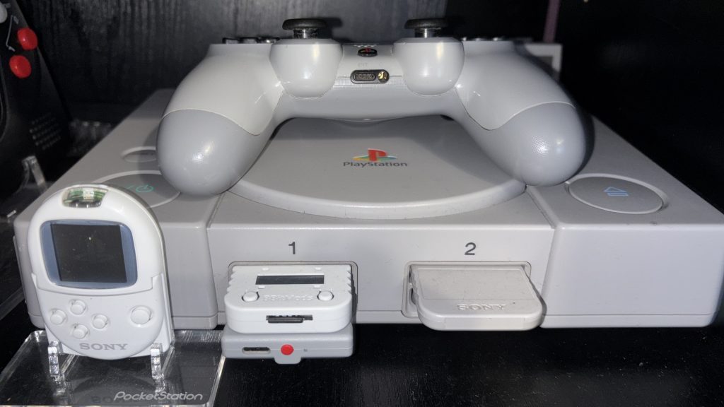 Output is handled by a RAD2x cable and the controller of choice is a 20th Anniversary Dual Shock 4 controller connected via an 8Bitdo Bluetooth receiver. I also use a MemCard Pro and have a PocketStation for no real reason!
